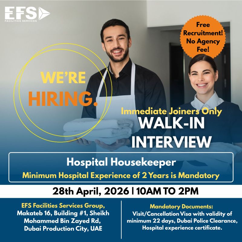 | To Apply Attend Walk In Interviews 📅 Dates: 28 April 2026 🕙 Time: 10:00 AM to 02:00 PM 📍 Location: EFS Facilities Service Group Office Dubai Production City Also Apply For Dubai Hotel Vacancies Apply Here Dubai 10th Pass Jobs Apply Here ![]() | |